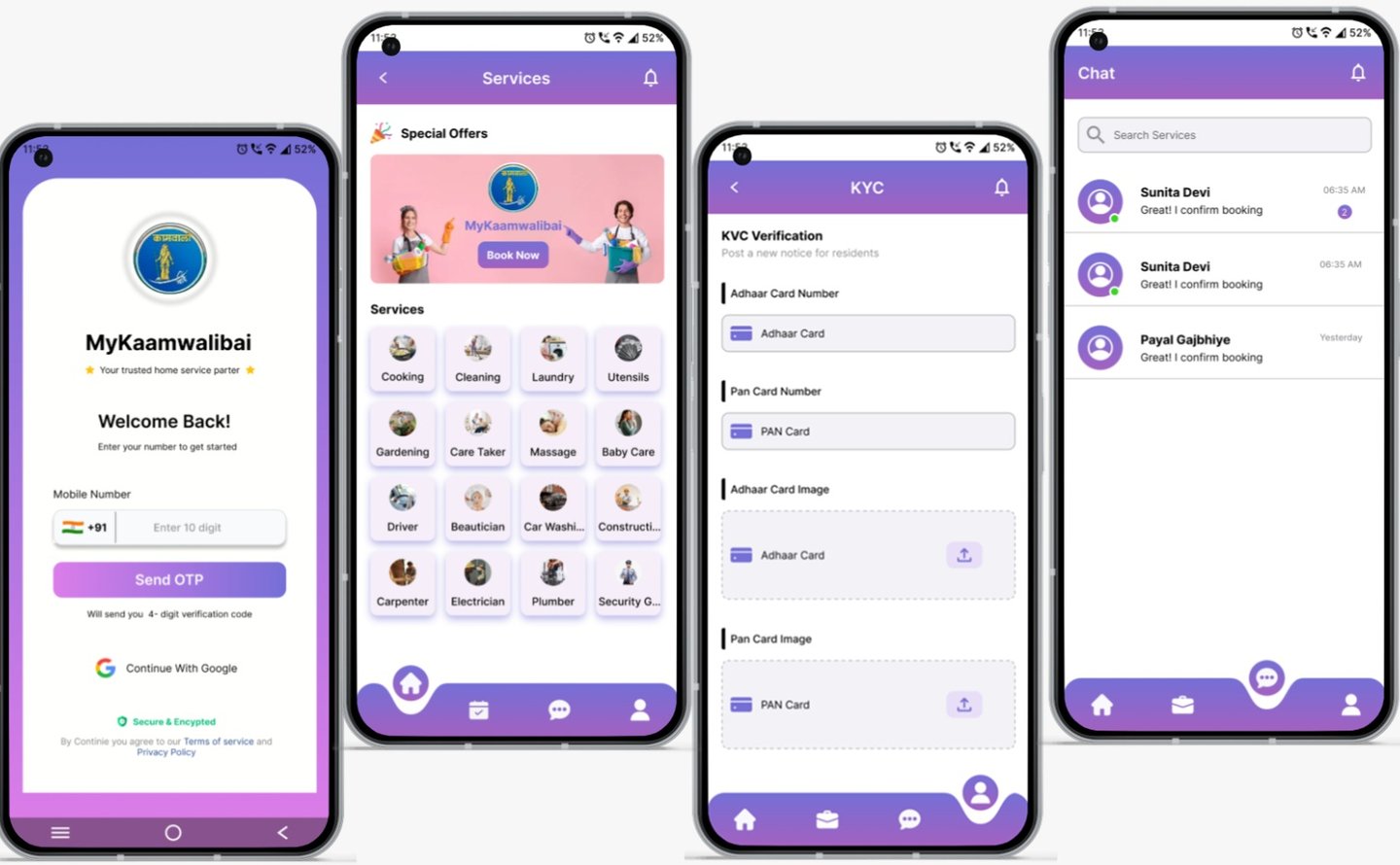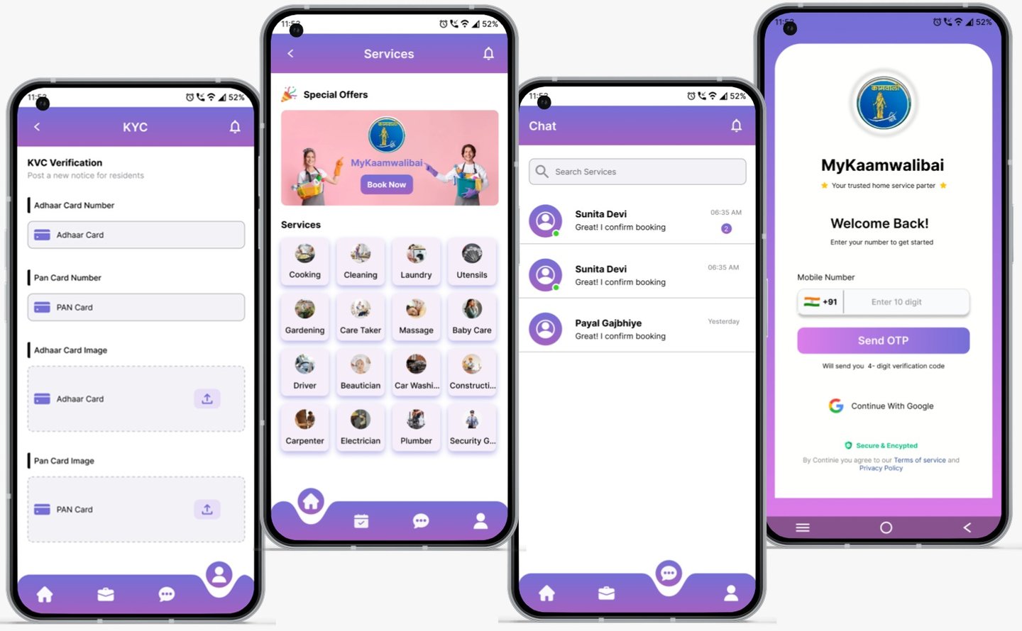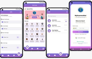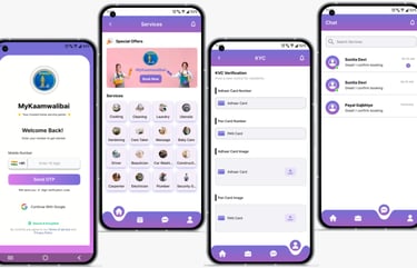 MyKaamwaliBai is a trusted home services app that connects users with verified domestic helpers. The app offers easy mobile login with OTP, secure KYC verification for service providers, and a wide range of services like cleaning, cooking, laundry, babysitting, caregiving, electrician, plumber, driver, and more. Users can browse services, book instantly, chat directly with service providers, and track bookings in real time. The app ensures secure, reliable, and convenient home services with a simple and user-friendly interface.